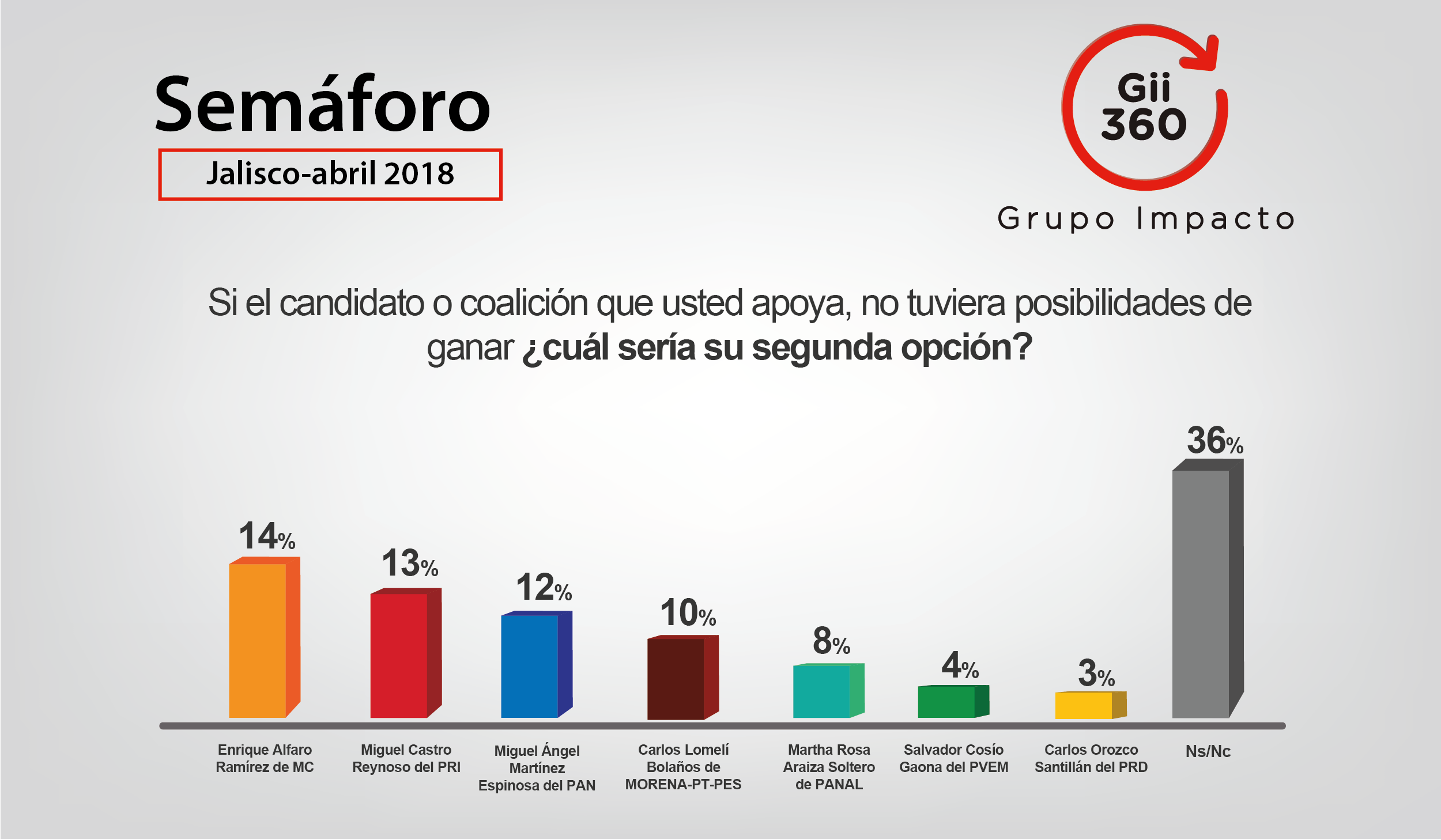 - Se le preguntó a los entrevistados cuál sería su segunda opción si su candidato no tuviera la posibilidad de ganar y el 14% dijo que votaría por Enrique Alfaro ocupando el primer lugar.